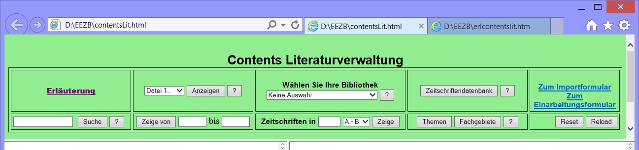 Im Unterschied dazu befindet sich das im folgenden dargestellte System mit allen Teilen ausschliesslich im Computer des Benutzers. Nur die integrierten Hyperlinkverbindungen führen zu entfernten Rechnern. In einer lokal installierten Version ist zusätzlich die gesamte integrierte Datenbankverwaltung funktionsfähig, dies allerdings auf den Internet Explorer beschränkt unter Verwendung der ActiveX-Technologie. Ansonsten läuft das System sowohl mit Firefox als auch mit dem IE.